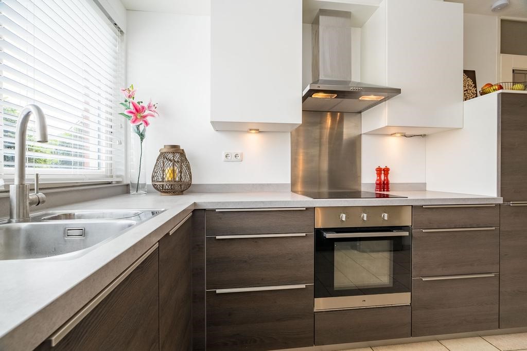 Aan de voorzijde bevindt zich de nette open keuken in U-opstelling met diverse (inbouw)apparatuur te weten; kookplaat, afzuigkap, oven, koel-vriescombinatie en een vaatwasser.