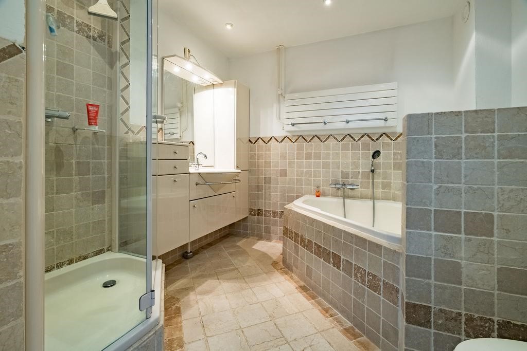 - De badkamer is afgewerkt met getrommeld marmer en voorzien van vloerverwarming;