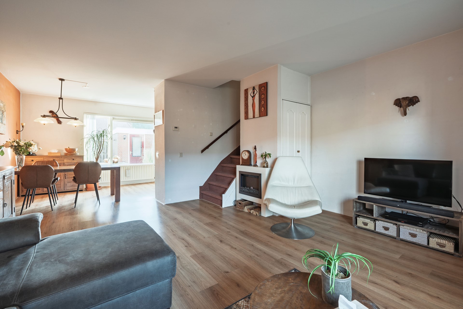 Via de voortuin bereikt men de entree van de woning. De hal met meterkast en een toiletruimte heeft een tussendeur naar de ruime en lichte woonkamer. De woonkamer heeft een praktische indeling met aan de voorzijde de zithoek.