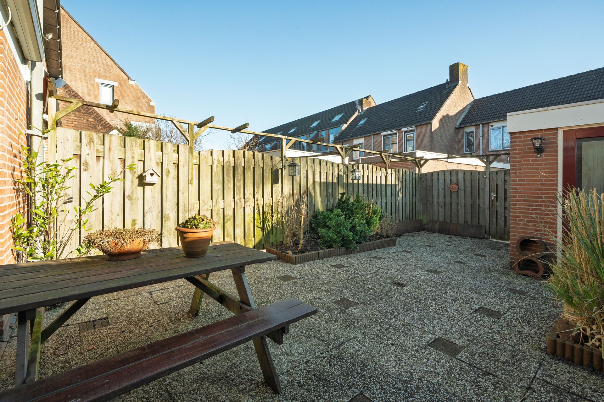 Vanuit de keuken is de achtertuin bereikbaar. de achtertuin ligt op het oosten en is bijna 9 meter diep. Achterin de tuin bevindt zich een vrijstaande stenen berging en een achterom.