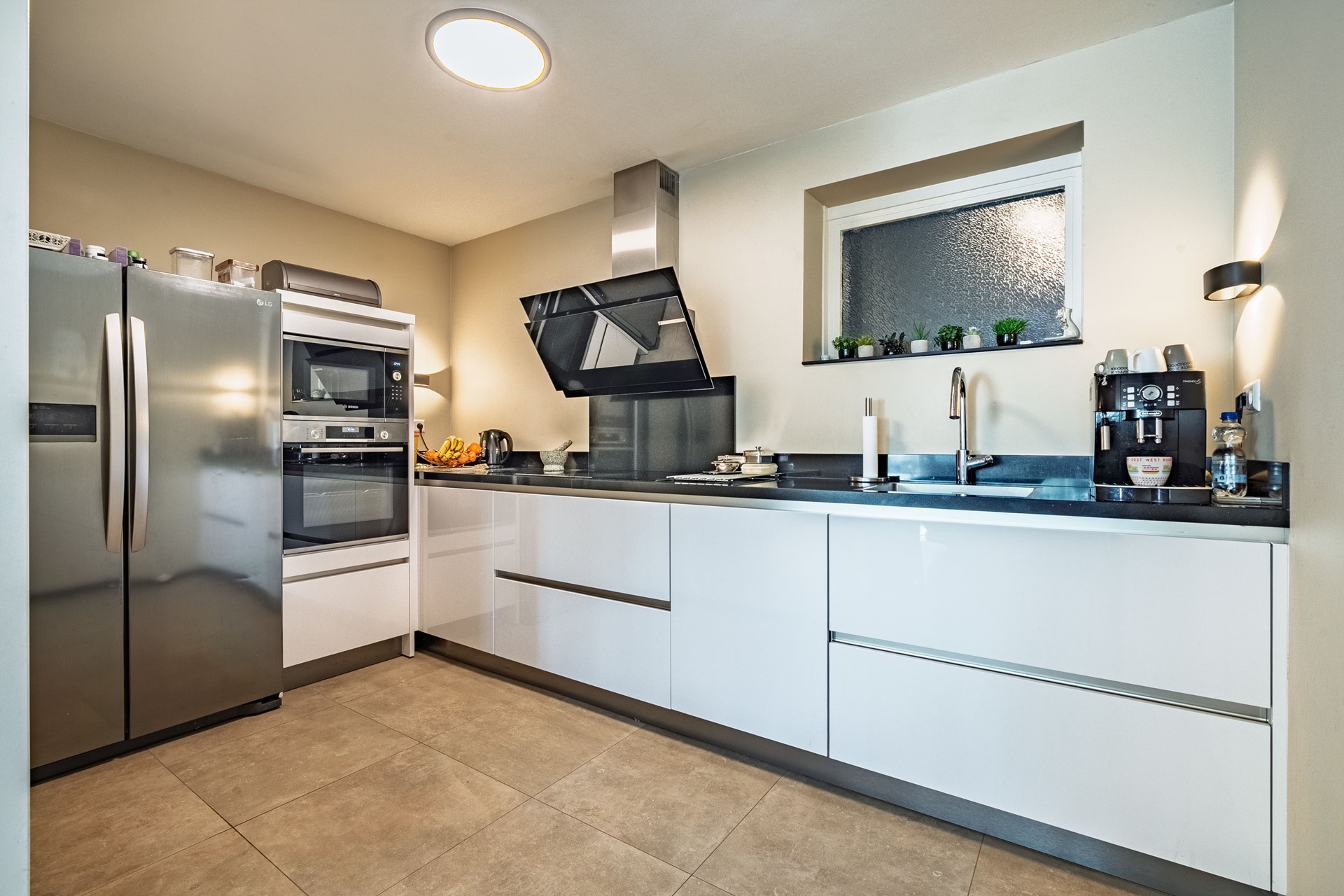 Vanuit de woonkamer is de moderne halfopen keuken bereikbaar. De keuken is uitgevoerd in een praktische hoekopstelling met een fraai aanrechtblad van graniet en is voorzien van diverse (Bosch)inbouwapparatuur te weten; een inductie kookplaat, afzuigkap, vaatwasser, oven, magnetron en een koel-/vriescombinatie.