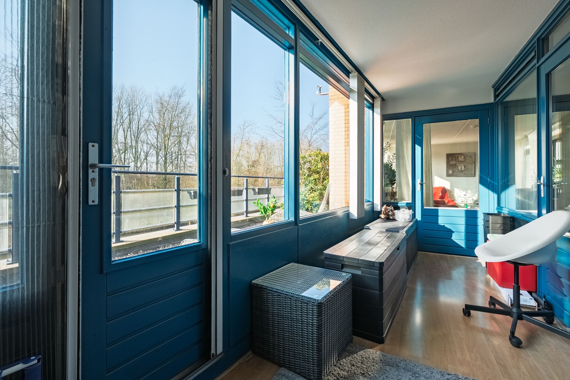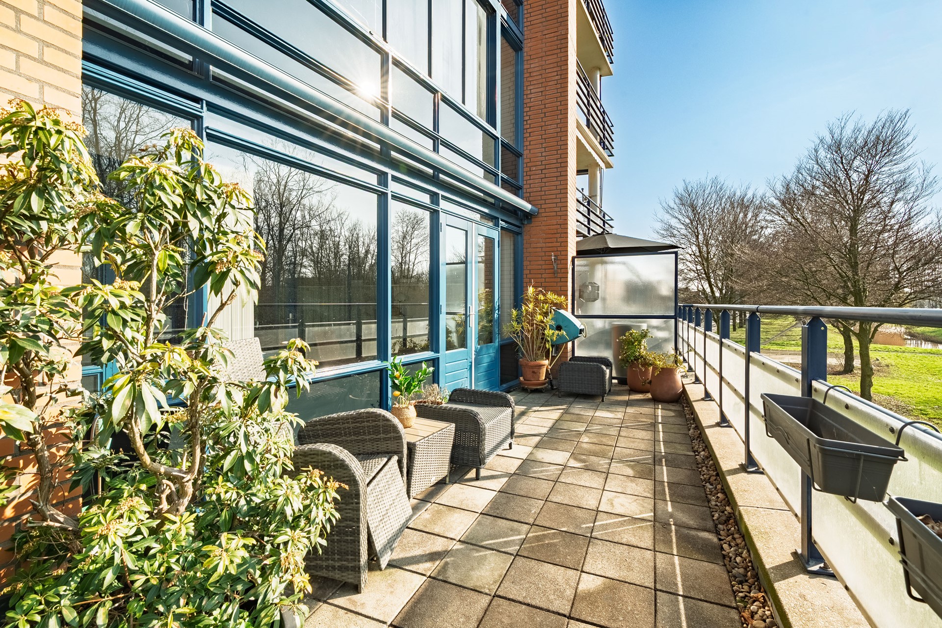 Wat deze woning bijzonder maakt, is de combinatie van ruimte, licht en privacy. Zowel vanuit de woonkamer als de loggia geven openslaande deuren toegang tot het royale dakterras. Twee elektrische zonneschermen zorgen voor extra comfort op zonnige dagen. Vanaf het terras en vanuit de leefruimtes geniet u van een fraai en weids uitzicht over het park, wat een gevoel van rust en vrijheid creëert.