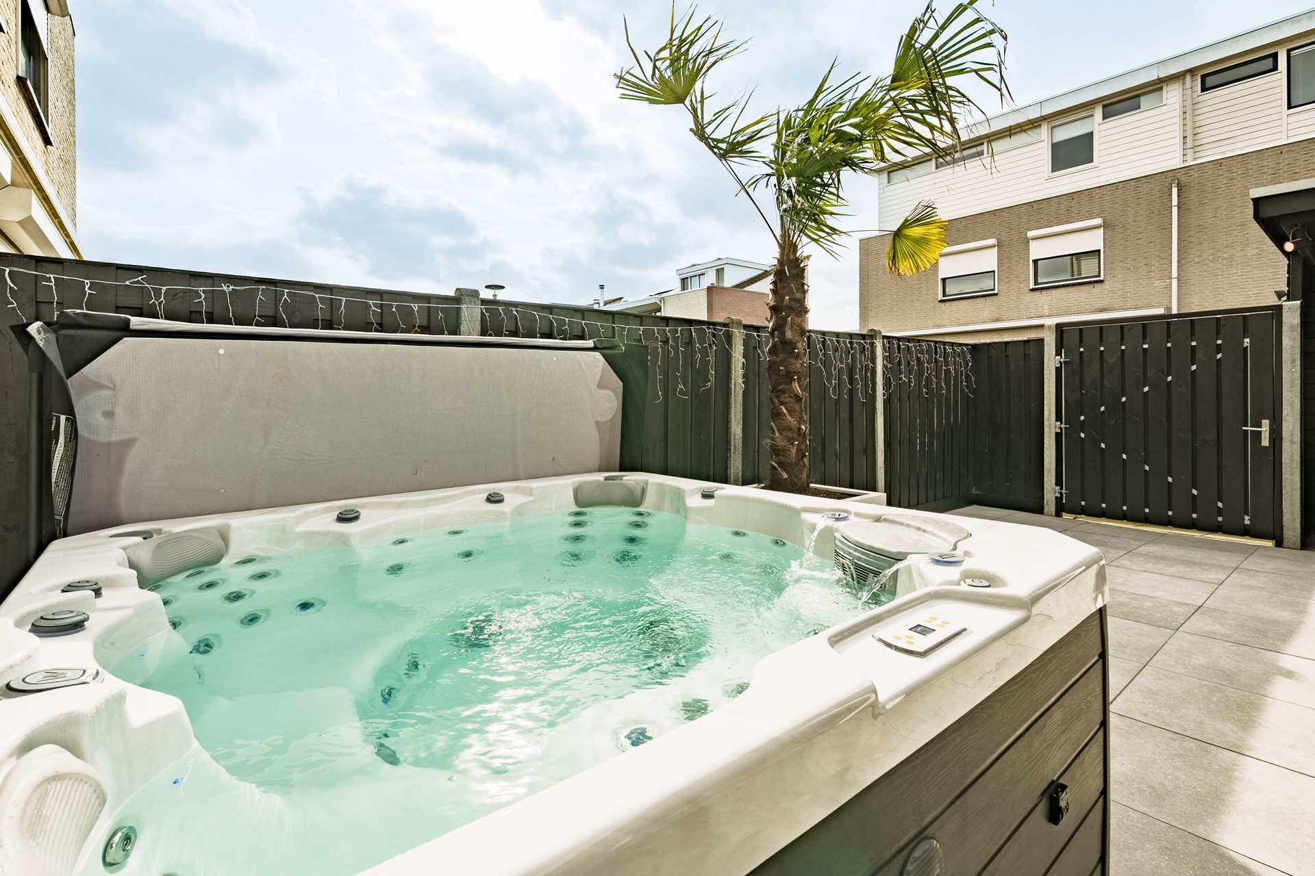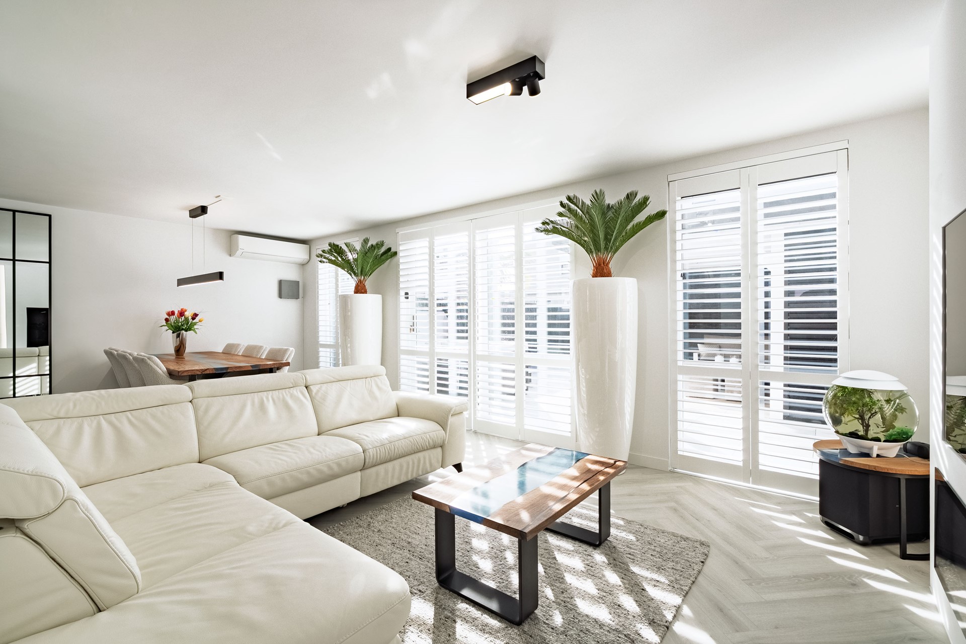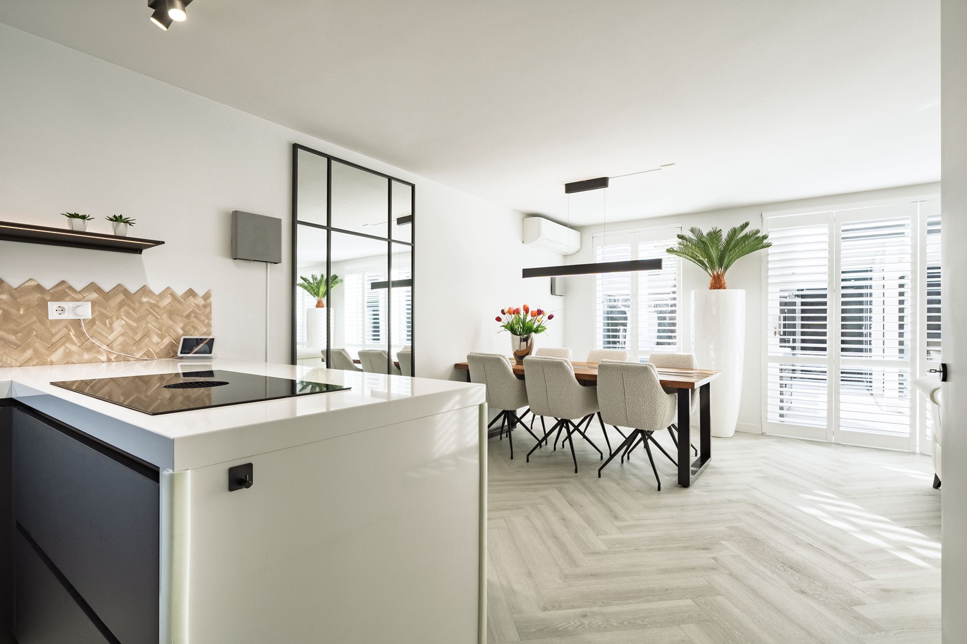 Bij binnenkomst ervaart u direct de hoogwaardige afwerking en het comfort. De ruime hal biedt toegang tot het moderne toilet, de meterkast en de woonkamer. De lichte en royale woonkamer is strak afgewerkt en voorzien van airconditioning, wat zorgt voor een aangenaam binnenklimaat in alle seizoenen.