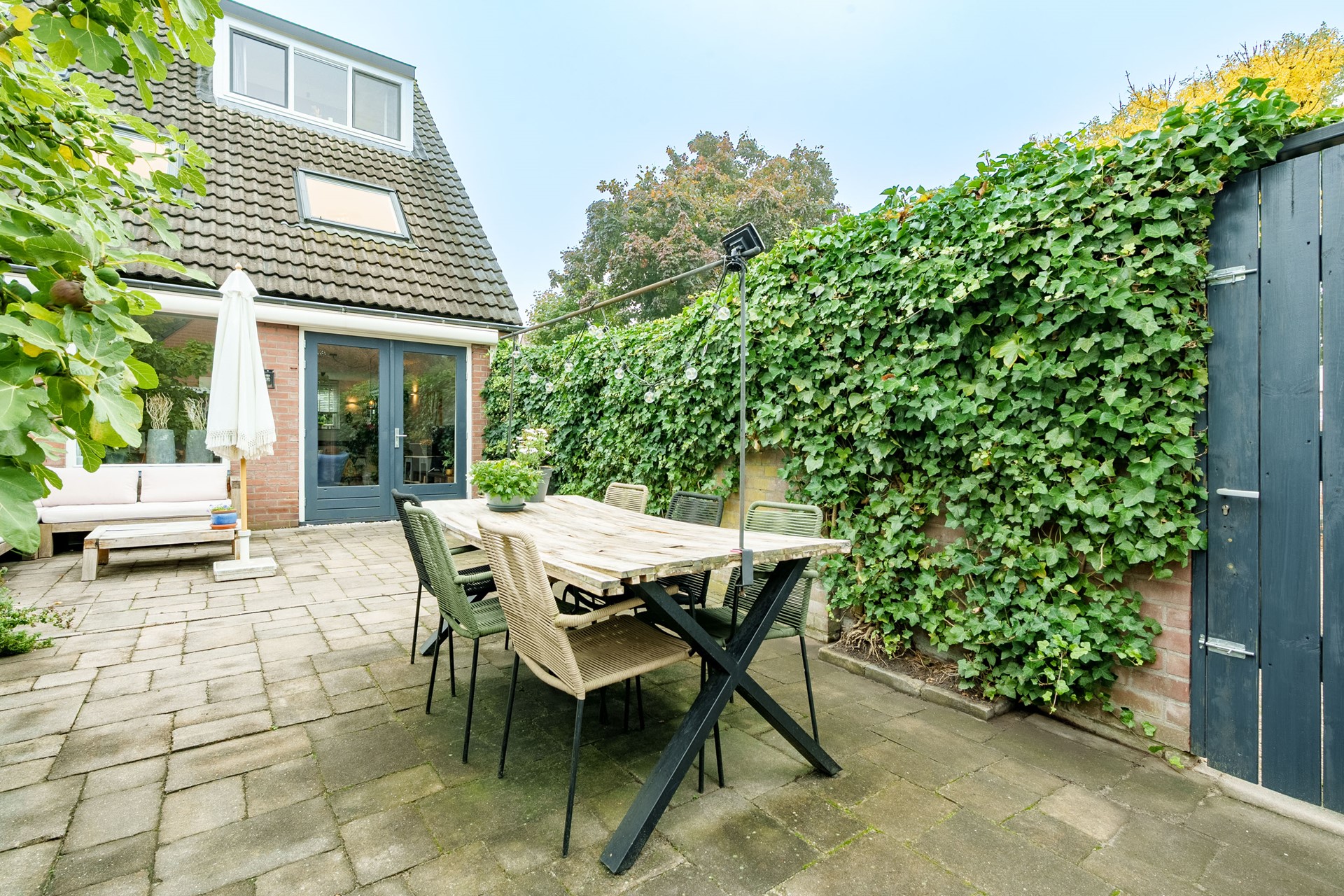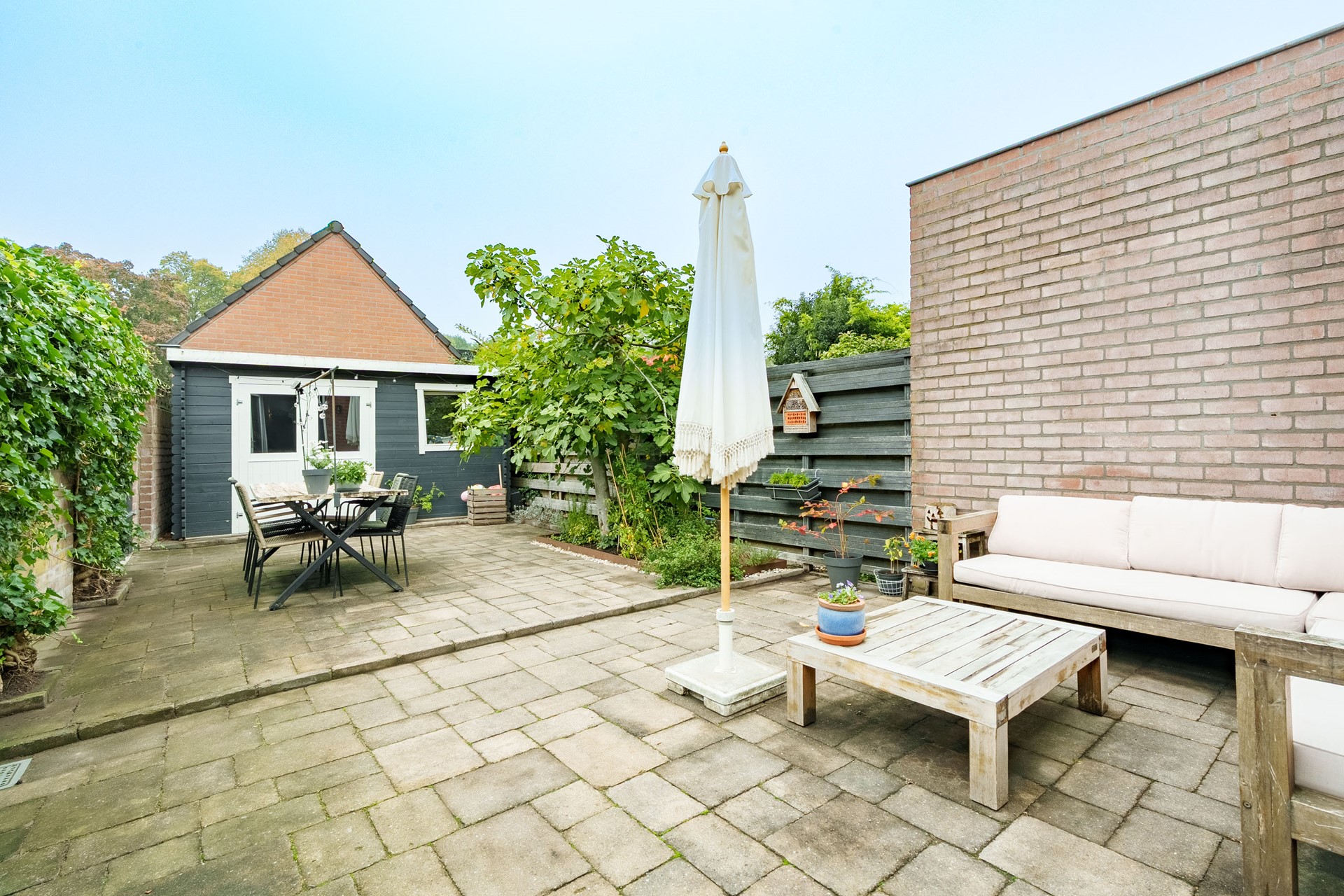 De diepe achtertuin ligt op het westen en biedt volop zon in de middag en avond. Achterin de tuin staat een vrijstaande houten berging, ideaal voor tuingereedschap en fietsen.