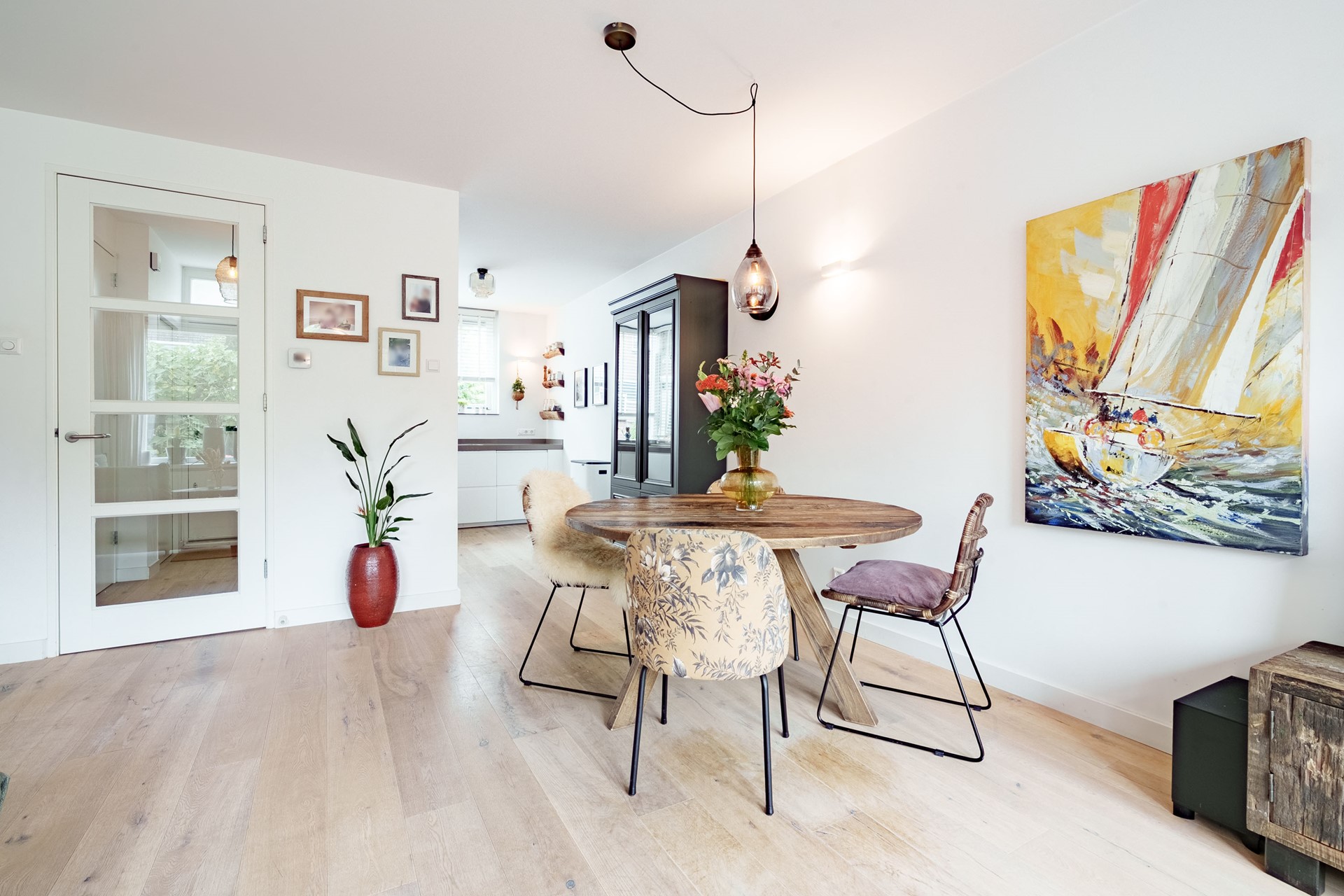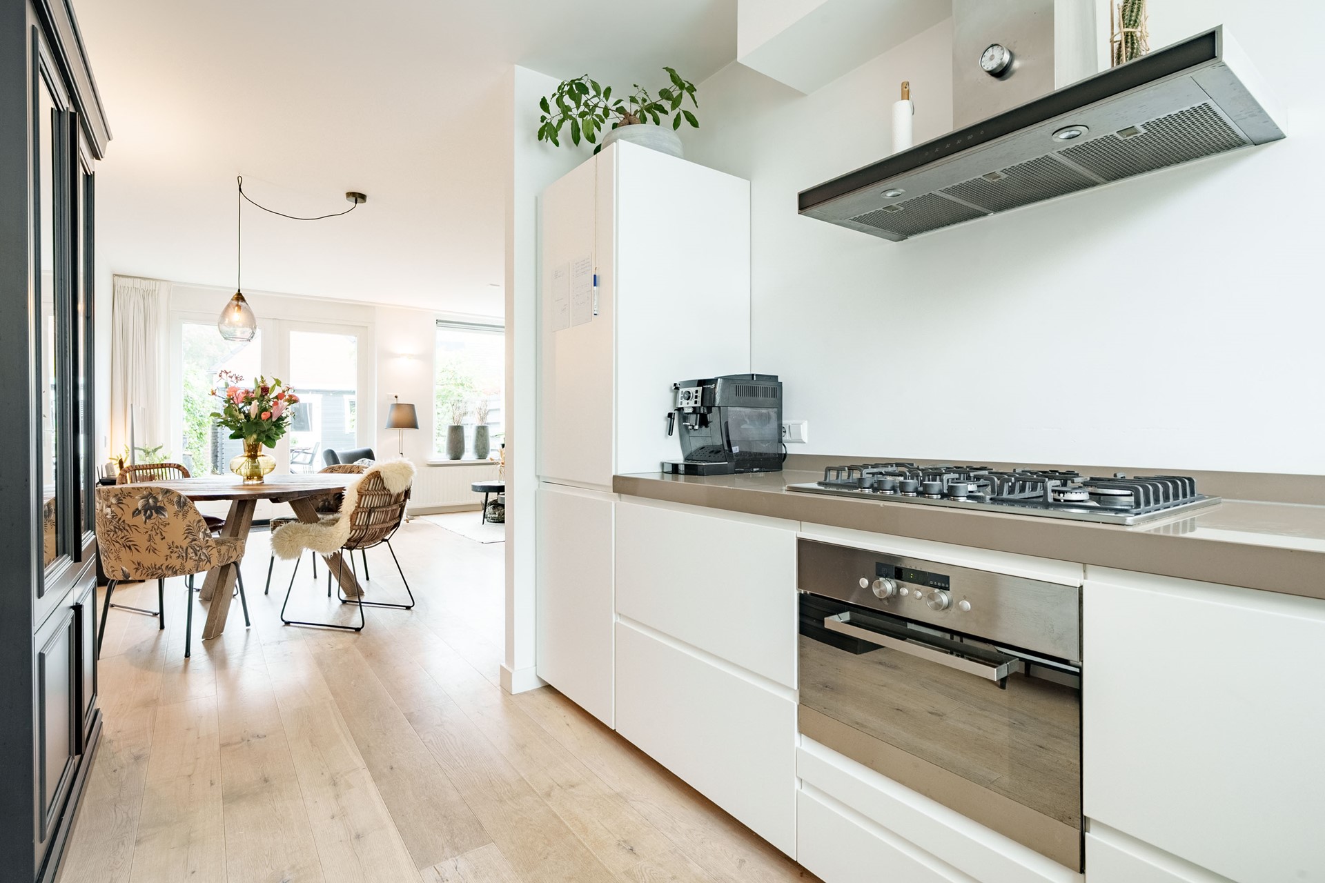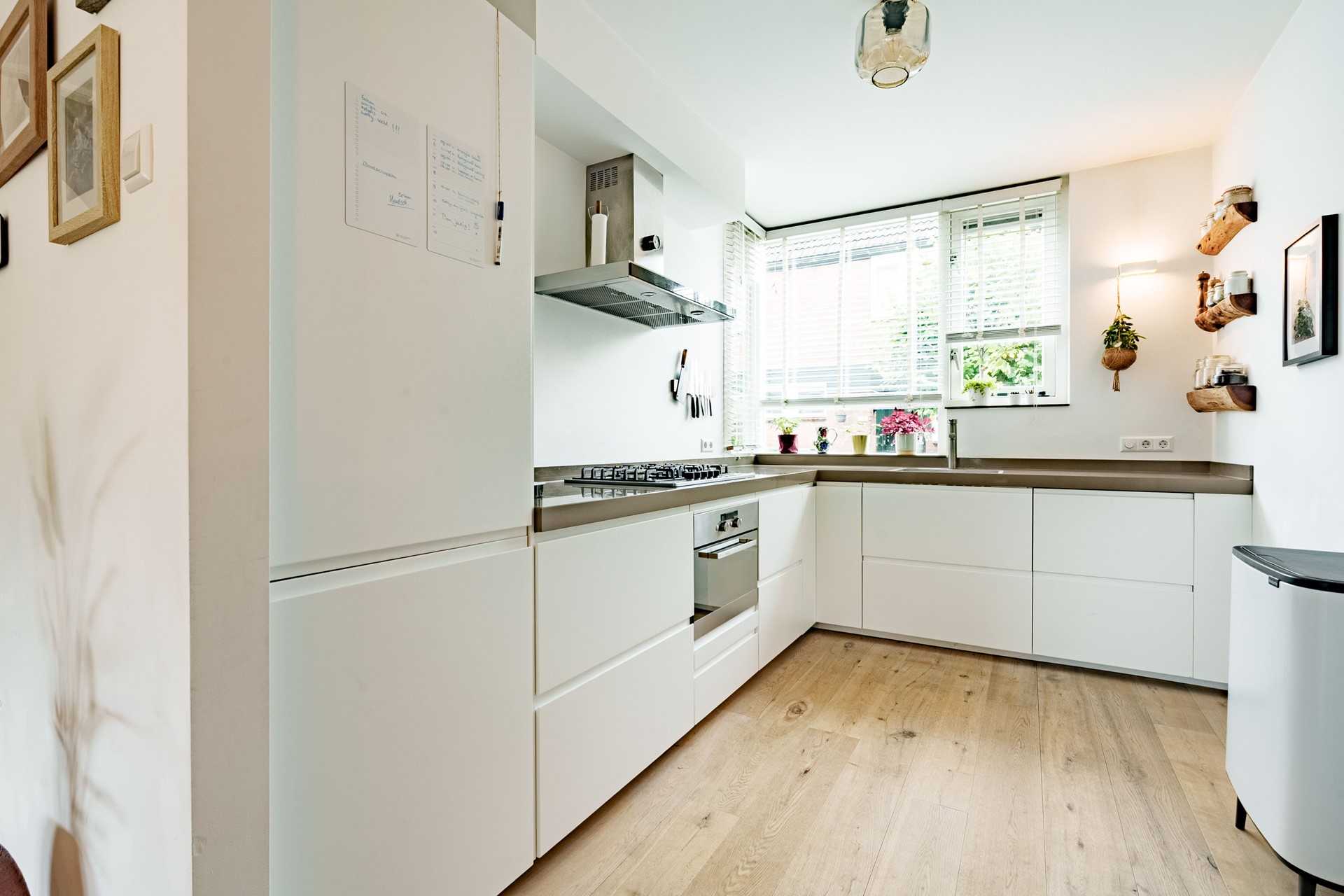 De lichte woonkamer is tuingericht en biedt volop ruimte voor een gezellige zithoek en eethoek. Aan de voorzijde bevindt zich de nette keuken, voorzien van diverse inbouwapparatuur: gasfornuis, afzuigkap, combi-oven, koel-/vriescombinatie en een vaatwasser.
