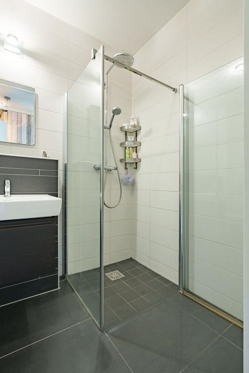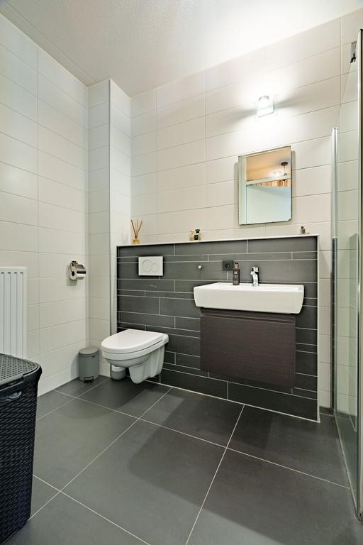 De badkamer is voorzien van een doucheruimte, een zwevend toilet en wastafel met meubel.