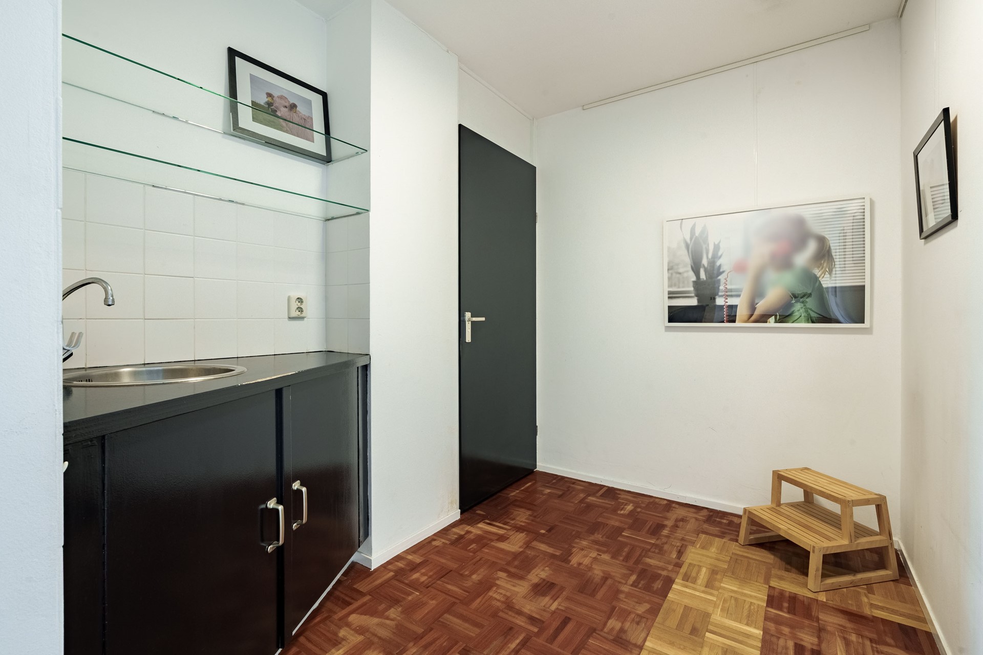 Bij binnenkomst tref je een ruime hal met toegang tot het toilet, de meterkast en de trap naar boven. Aan de voorzijde bevindt zich een kamer die zich uitstekend leent als praktijkruimte, kantoor aan huis of atelier. Dankzij de gunstige ligging en de eigen entree is dit dé ideale plek om werk en privé gescheiden te houden.