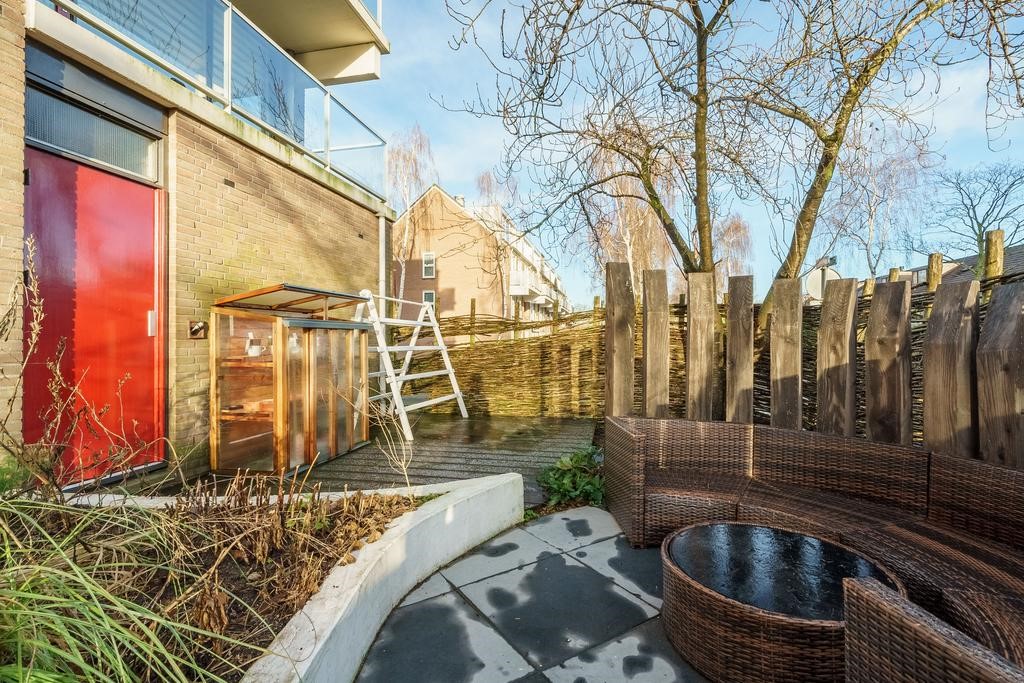De achtertuin is fraai aangelegd en beschikt over een fijne combinatie tussen groen en bestrating. Zo bevindt zich direct naast de woning een border en zijn er 3 verschillende plekken gecreëerd om van de zon te genieten. Daarnaast is er een separate berging.