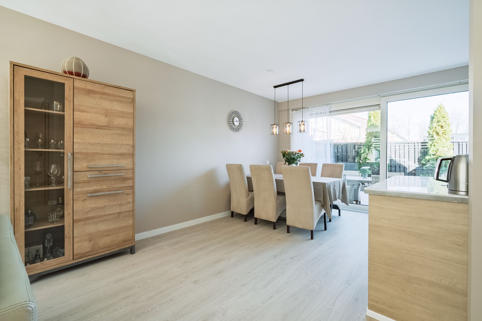 Aan de achterzijde van de woning bevindt zich de moderne keuken die in 2022 is vernieuwd. De keuken is voorzien van diverse apparatuur te weten; een kookplaat, magnetron, oven en afzuigkap. Er is voldoende ruimte voor een grote eethoek. Middels de grote schuifpui is de achtertuin bereikbaar. De achtertuin heeft een speelse indeling en gesitueerd op het noorden. In de tuin bevindt zich de aangebouwde stenen berging en een achterom.